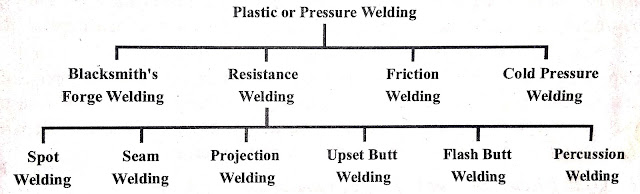 In plastic or pressure Welding process, pieces of metal to be joined are heated to a plastic state and then forced together by external pressure. In this method no filler material is used. Plastic welding may be further classified as follows-
